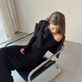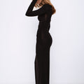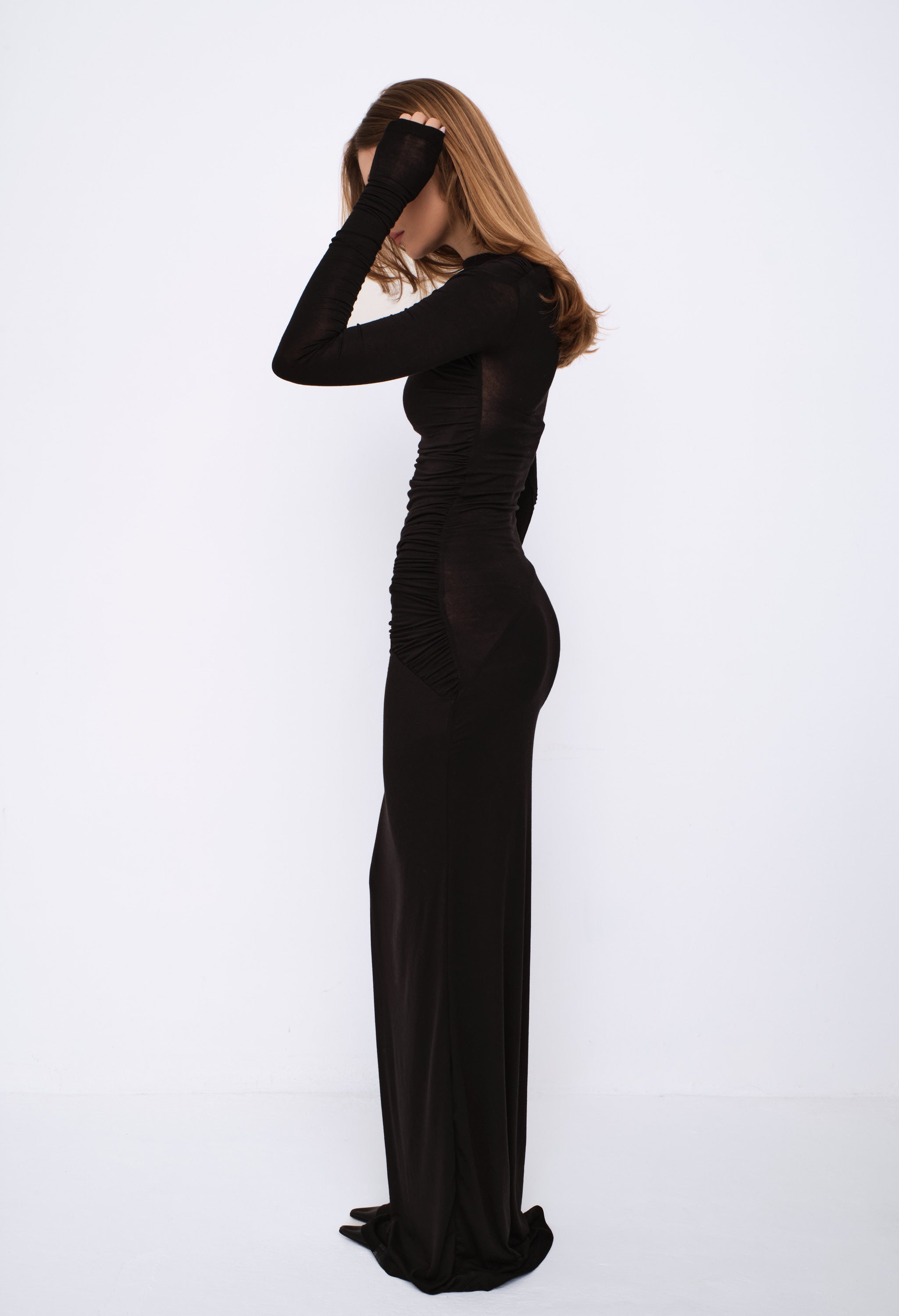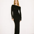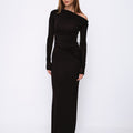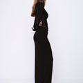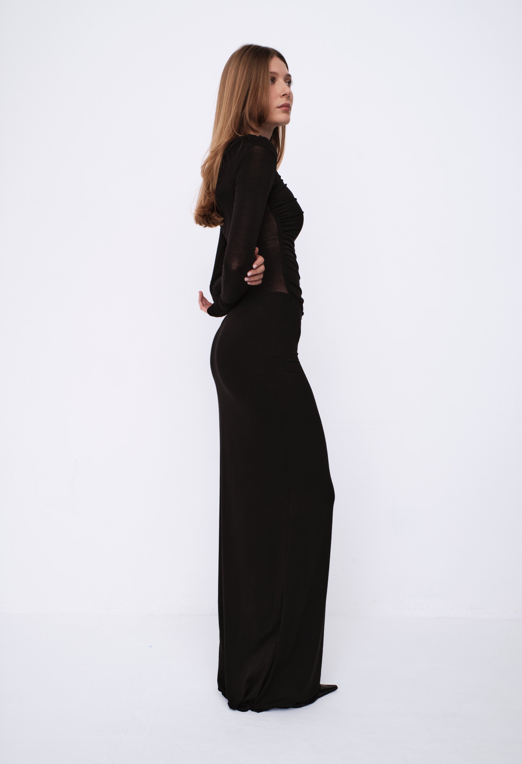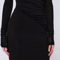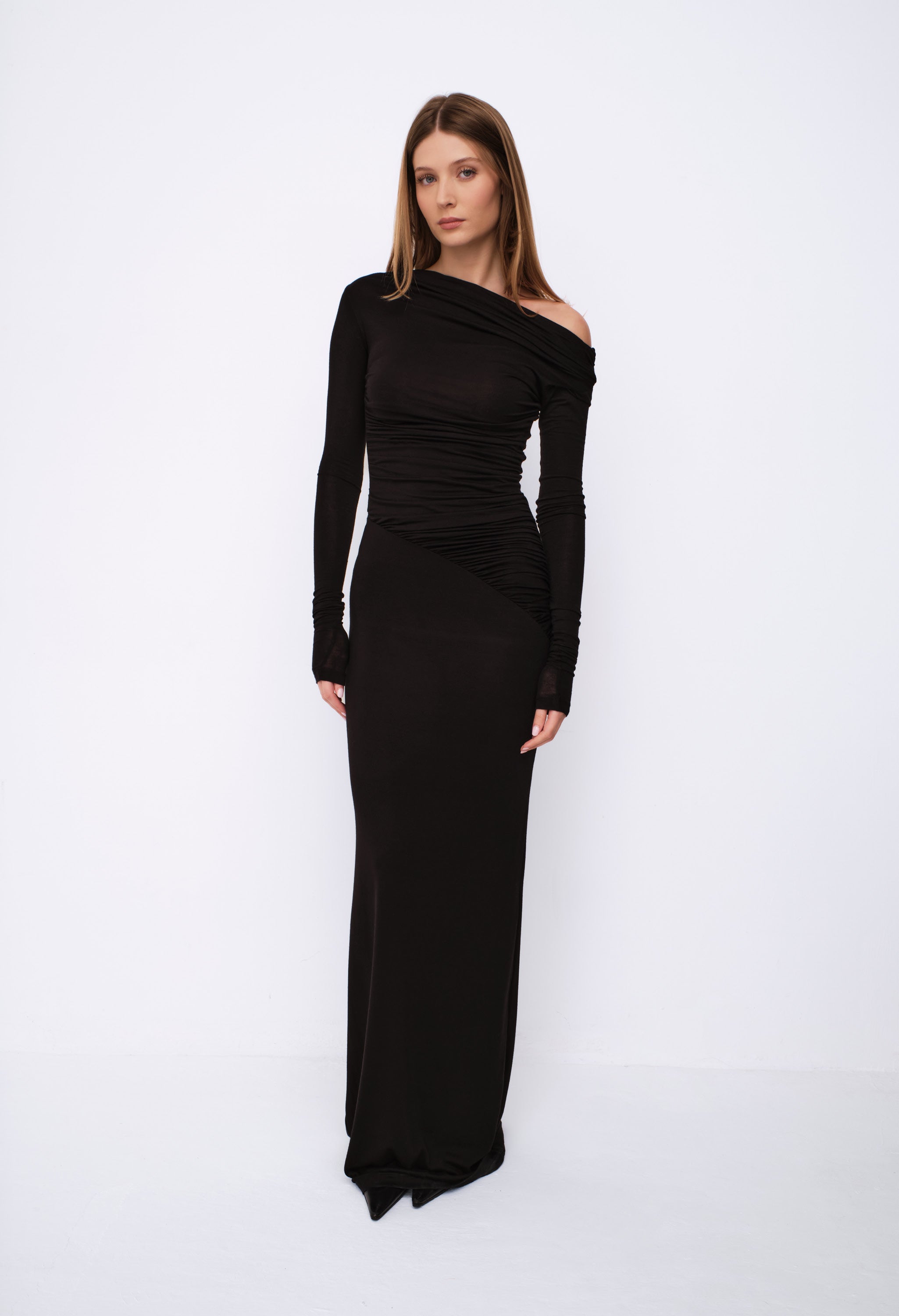 La silhouette aderente esalta le curve, mentre il drappeggio sulla vita slancia la figura. Il dettaglio distintivo è la spalla scoperta asimmetrica che dona carattere e modernità. Realizzato in tessuto stretch di alta qualità, morbido e caldo, è leggermente trasparente nella parte superiore, mentre la gonna è doppiata per totale copertura.