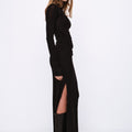 Questo abito lungo in morbido tessuto stretch ridefinisce l'eleganza serale con un cut-out drappeggiato sui fianchi che svela la pelle con raffinatezza.