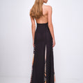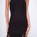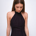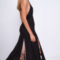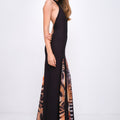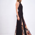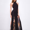 Abito lungo con schiena scoperta e collo halter. Realizzato in georgette semi trasparente, caratterizzato da ampi spacchi realizzati con motivo stampato, presenta aperture delicate sulla gonna e chiusura con zip laterale. Un capo pensato per valorizzare la silhouette con discrezione ed eleganza. Made in Italy.